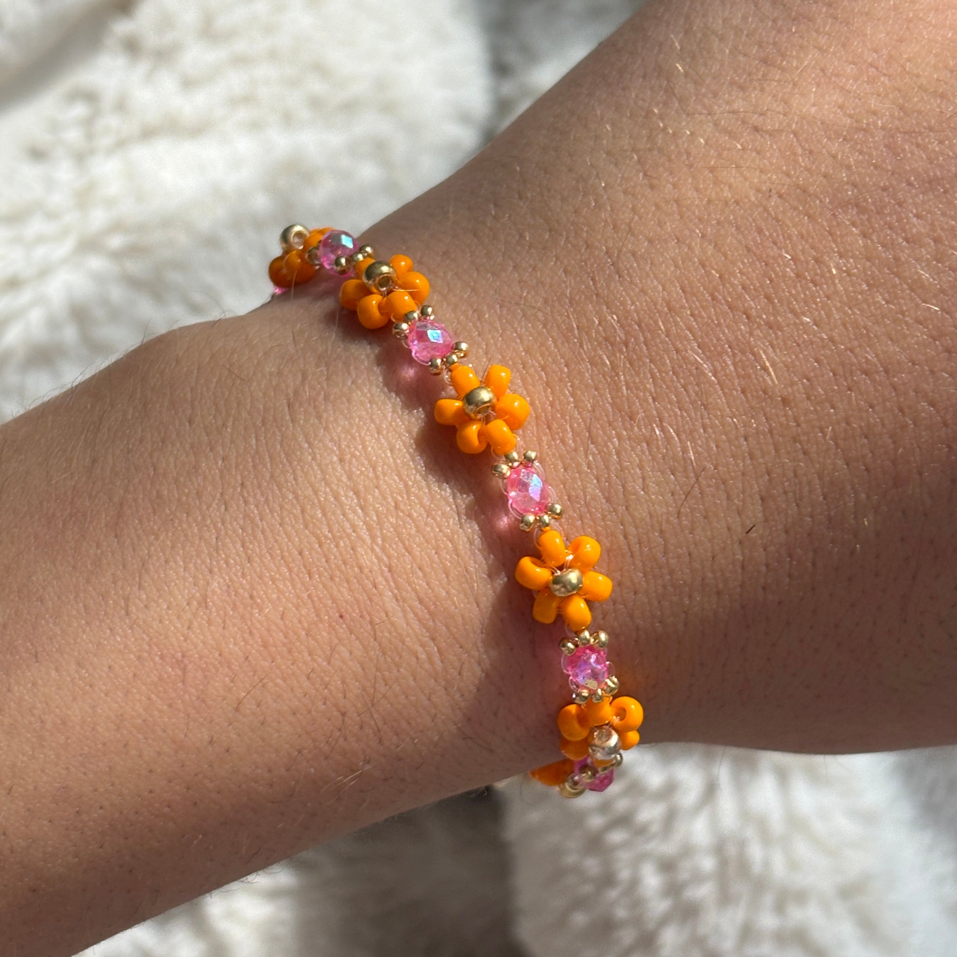 A vibrant and dreamy bracelet, designed with bold orange florals and shimmering pink crystals that catch the light like hidden easter eggs. Each detail is carefully woven on a durable nylon string, and finished with a 14k gold-plated stainless steel extension chain, clasp, and crimp for a polished glow. Inspired by the mystery of TS12.